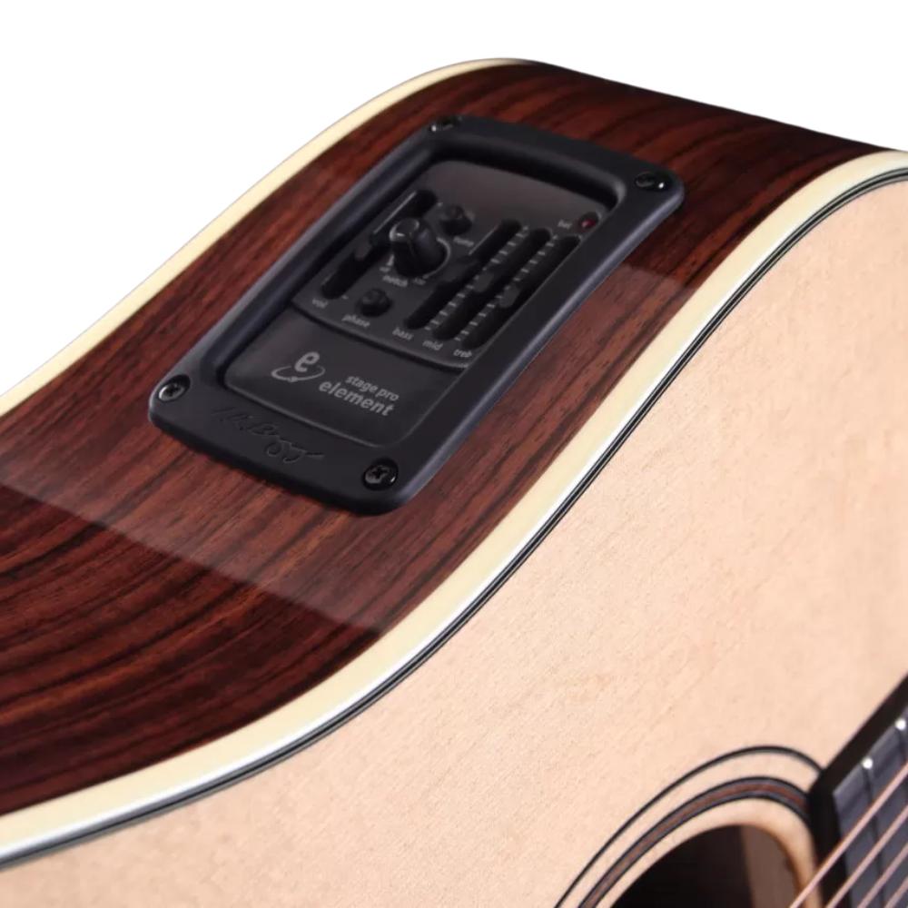 The Green Master’s Choice comes with LR Baggs Stagepro Element, which is an upgraded version of the LR Baggs Element Active System – Volume Tone Control. The additional features of the Stagepro Element include a side-mounted preamp with a three-band equalizer and phase inversion as well as a sensitive onboard tuner. With a clean classy look, the Stagepro Element pickup system provides easy battery access and includes Garrett Null notch filter that delivers a warm pristine sound even under the most challenging conditions.