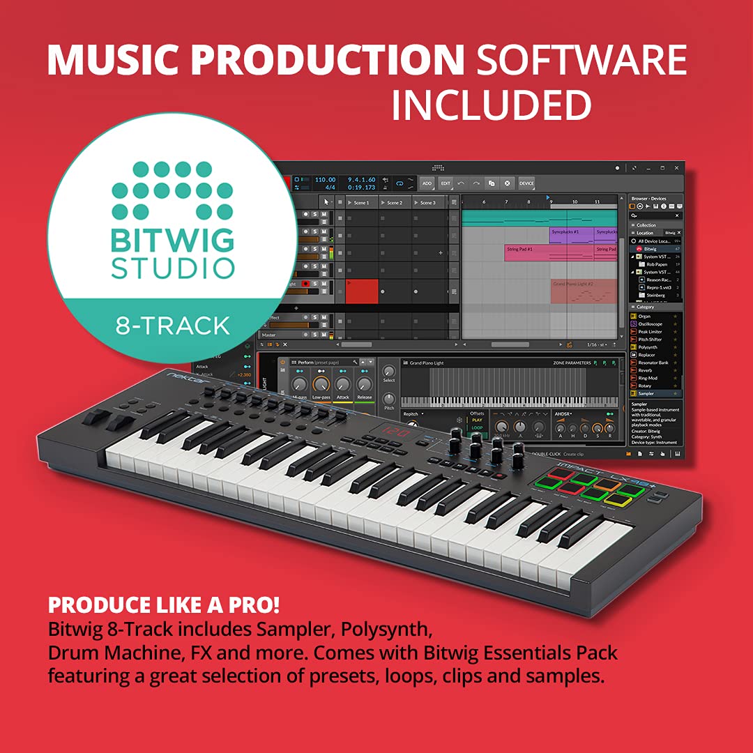 Bitwig 8-Track is included with every Impact LX+ so you can start producing, performing, and designing sounds like a pro from day one. Bitwig 8-Track gives you access to over 50 software instruments and effects for use on up to 8 audio or MIDI project tracks, and you can use any 3rd party VST plug-ins you might own, too. The ‘Bitwig Essentials Package’, a highly versatile handpicked selection of loops, clips and samples, is also included to help you get started. So put all that together and you have a powerful sketchpad for your musical ideas featuring the acclaimed workflow of Bitwig Studio.