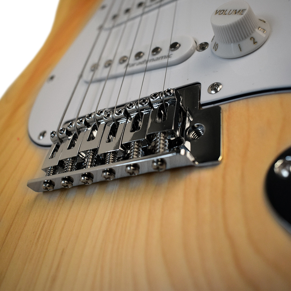 Introducing the NEWEN Stratocaster Style Electric Guitar Made in Argentina. This exceptional guitar is crafted from solid white oak wood, giving it rich sound harmonics and sustain. The handle is built with a maple and rosewood storage, and the steel core provides greater stability in the tuning. The real grain of the wood is given a semi-finished lacquer finish, and a Poliuretano satinado finish tops it off. With its Paradinamic® Bridge & Neck Pickup, 5 Position switch for Pickup Selector S/S/S CONFIGURATION, maple neck with rosewood fretboard, 22 frets and synthetic bone nut, white dot inlays, chrome finish hardware, 3 Ply White/Black/White pickguard and standard metal machine heads, you’ll be strumming on quality. Get your NEWEN Stratocaster Electric Guitar today!
